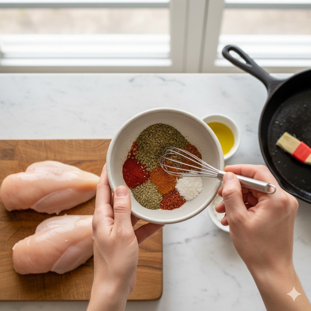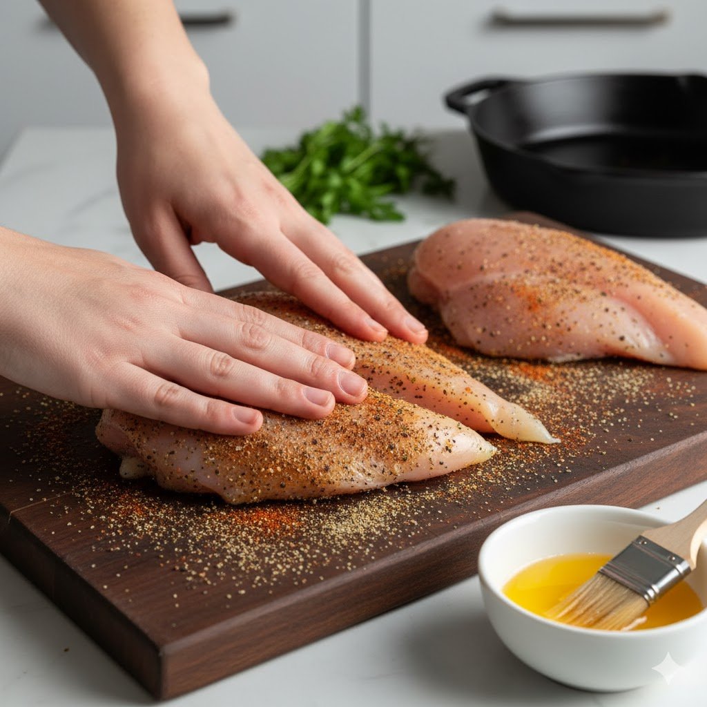 Rub the chicken with olive oil or melted butter. Then coat both sides with the spice mix, pressing gently so it sticks.