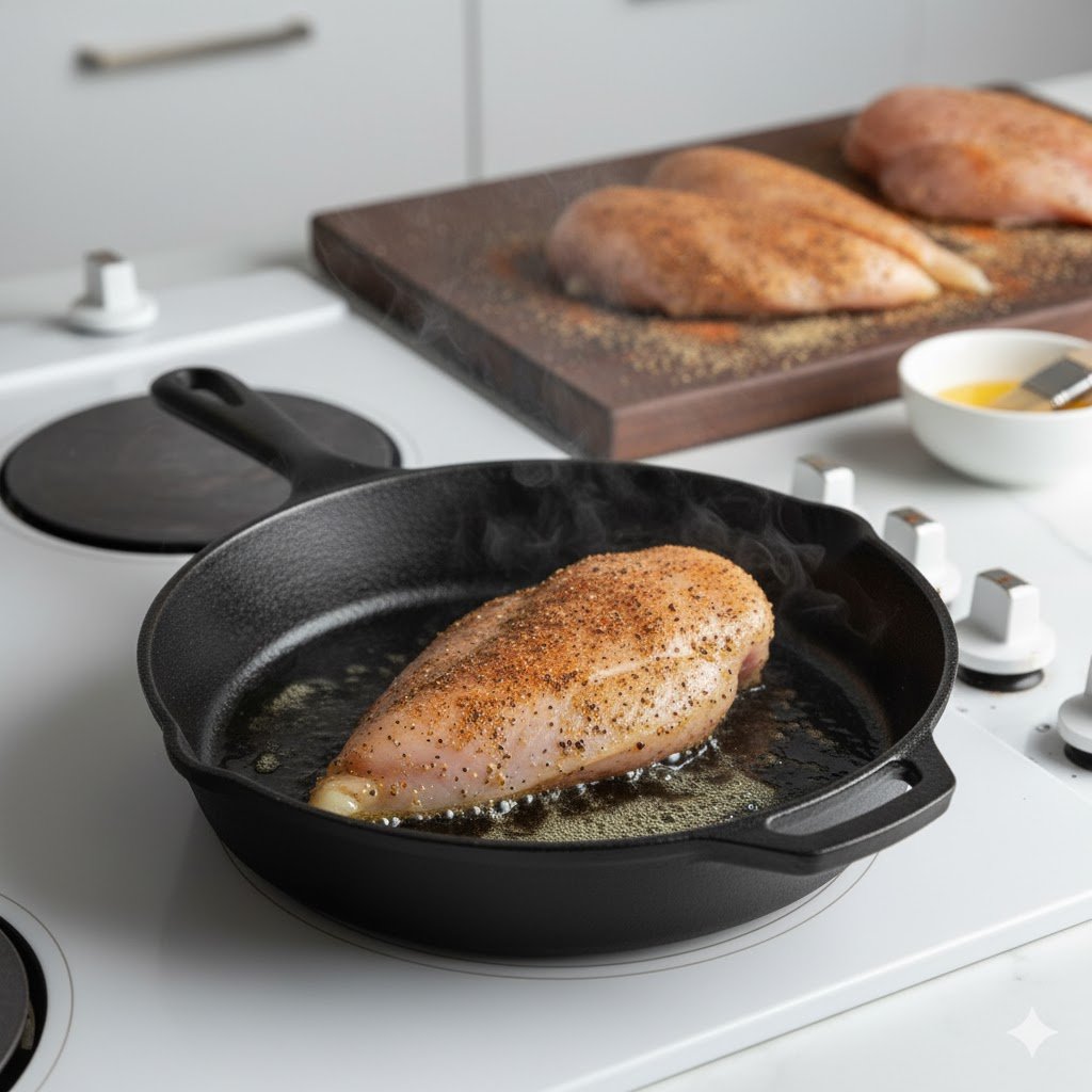 Heat a heavy skillet (like a cast iron pan) on medium-high until very hot. Place the chicken in and cook for about 4–5 minutes per side until the outside looks dark and charred but not burnt.