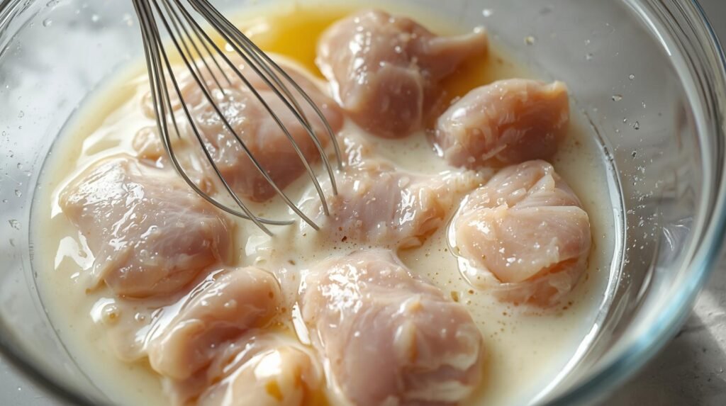 In a bowl, mix buttermilk and egg. Add the chicken pieces and let them soak for 20–30 minutes (or refrigerate for up to 2 hours).
