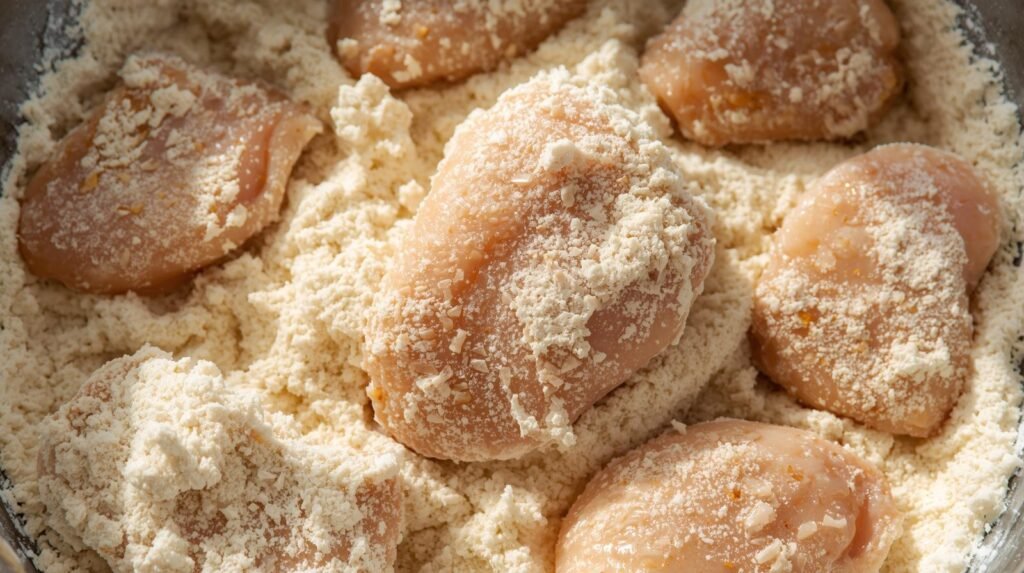 Remove chicken pieces from the buttermilk mixture, let excess drip off, and coat them evenly in the flour mixture. For extra crunch, double dip — back into the buttermilk and then the flour again.