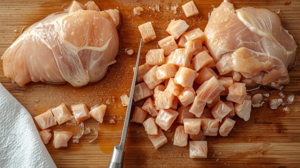 Cut chicken breasts into small bite-sized pieces. Pat them dry with a paper towel.