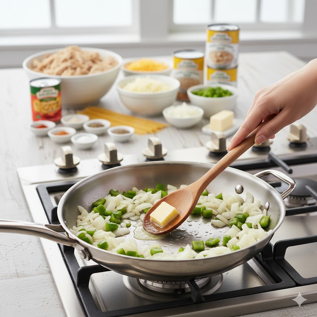 In a large skillet, melt butter and sauté onion and bell pepper until soft.