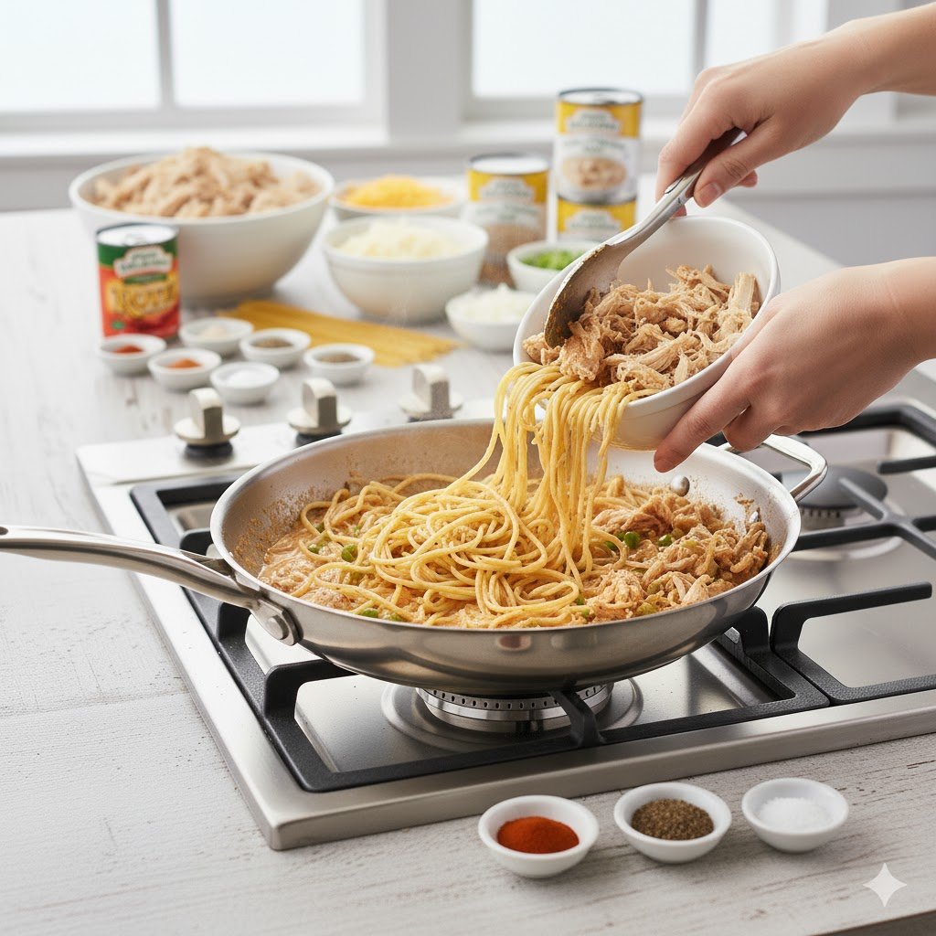 Add shredded chicken and cooked spaghetti to the sauce. Mix well.