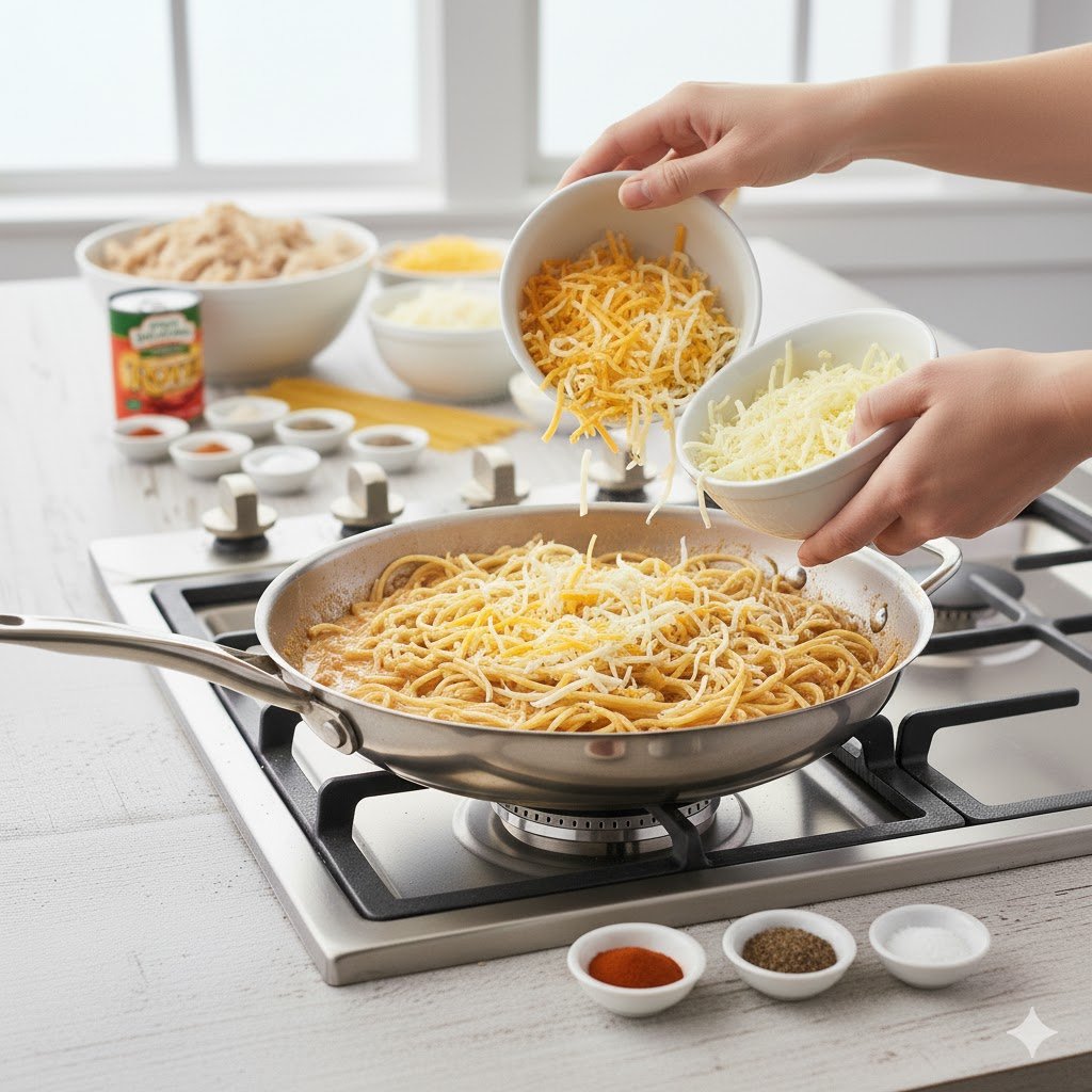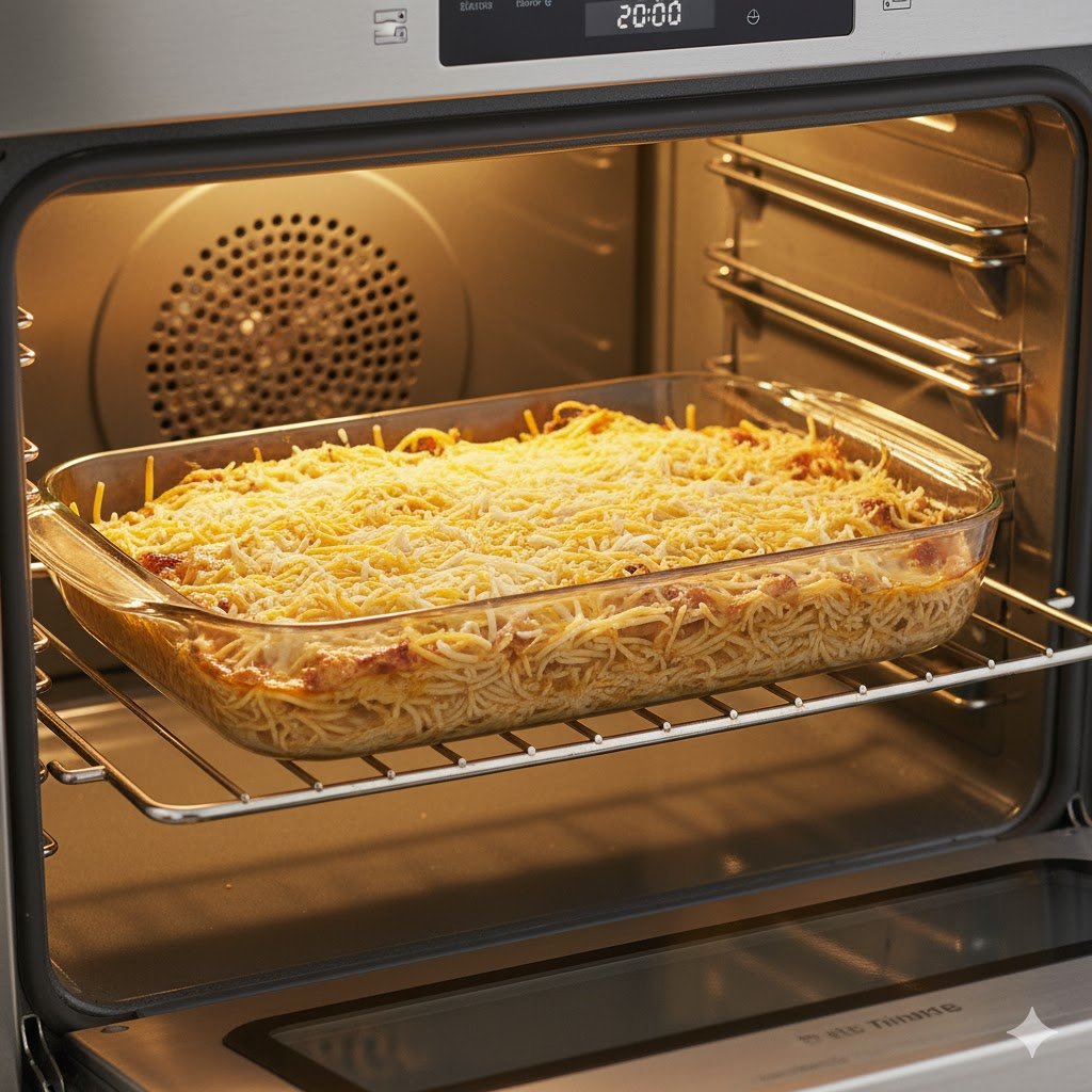 Transfer to a baking dish, top with remaining cheese, and bake at 350°F (175°C) for 20–25 minutes, until bubbly and golden.