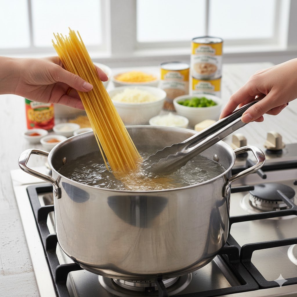 Boil spaghetti in salted water until al dente. Drain and set aside.