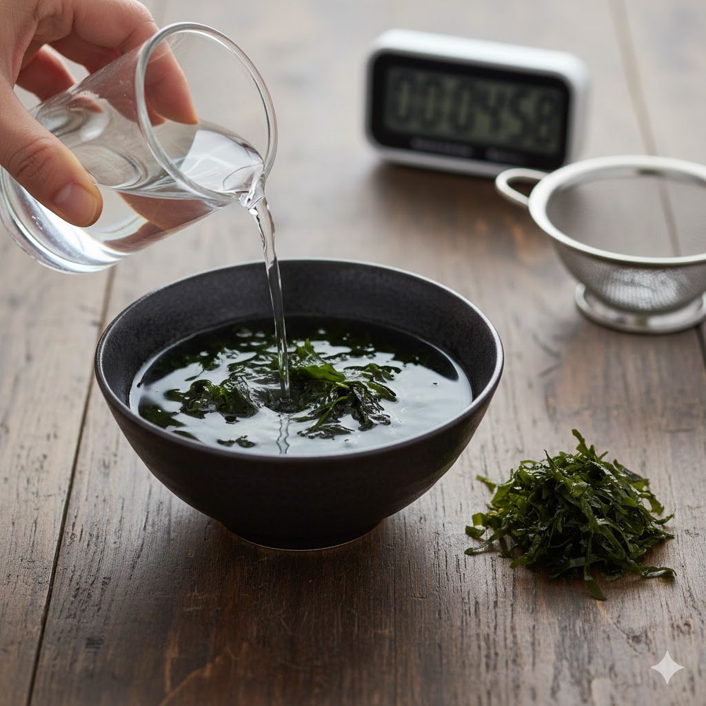 - Add dried wakame to a small bowl of water.