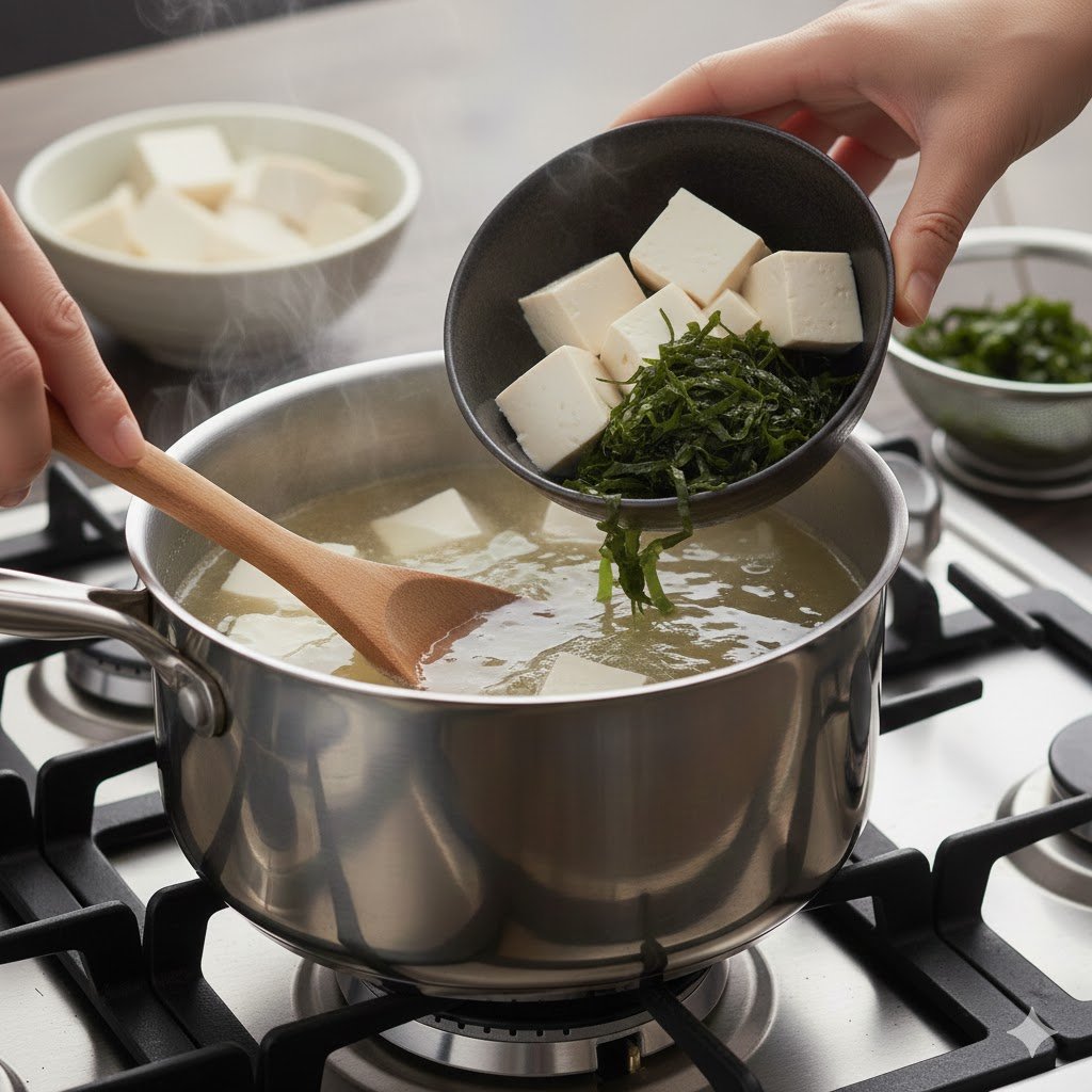 - Add the soft tofu cubes and rehydrated wakame.