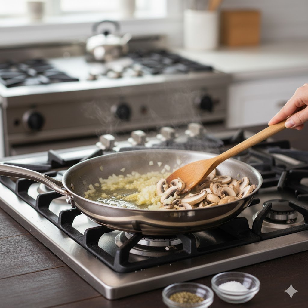 In the same skillet, add butter and sauté garlic and onions for 1–2 minutes until fragrant. Add the mushrooms and cook until they release their moisture and turn golden brown.