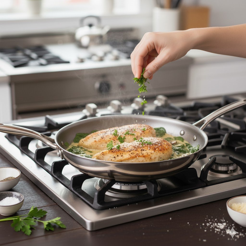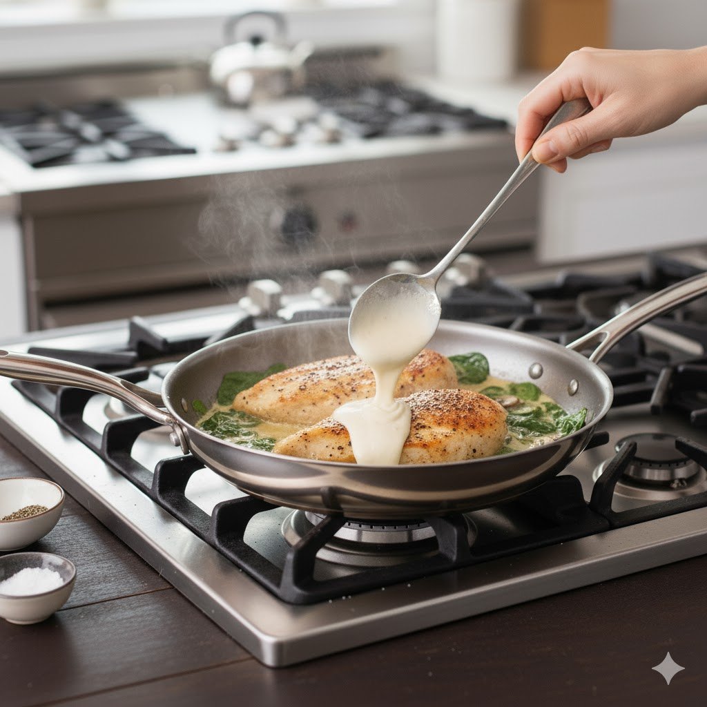 Return the chicken to the pan, spoon the creamy sauce over it, and simmer for another 2–3 minutes to absorb all flavors.