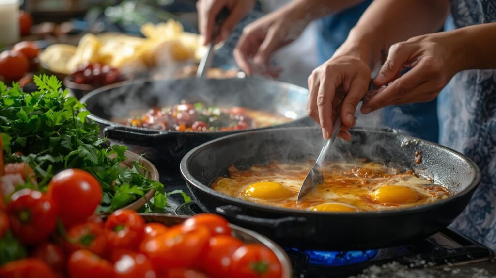 - In another pan, fry the eggs sunny-side up.
