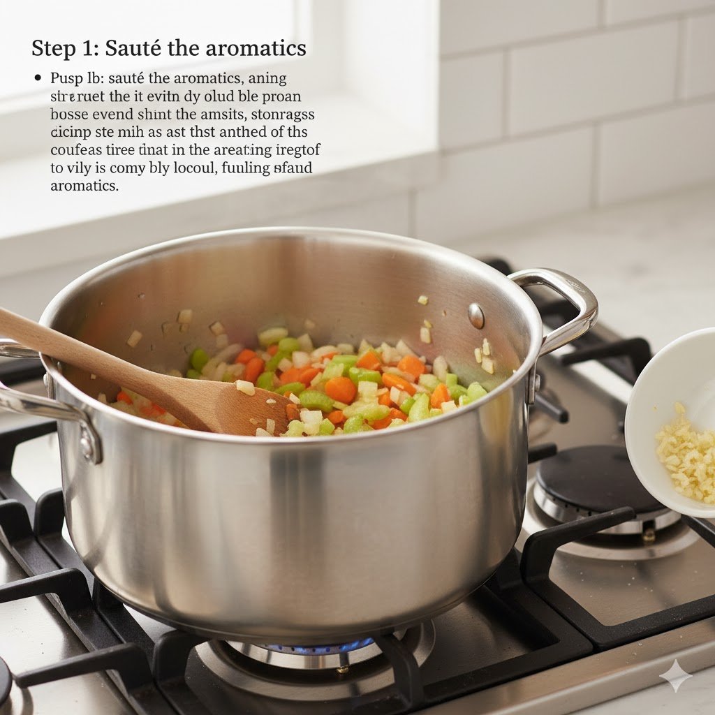 Heat olive oil in a pot. Add onions, celery, and carrots. Cook until softened. Add garlic and cook for 30 seconds.