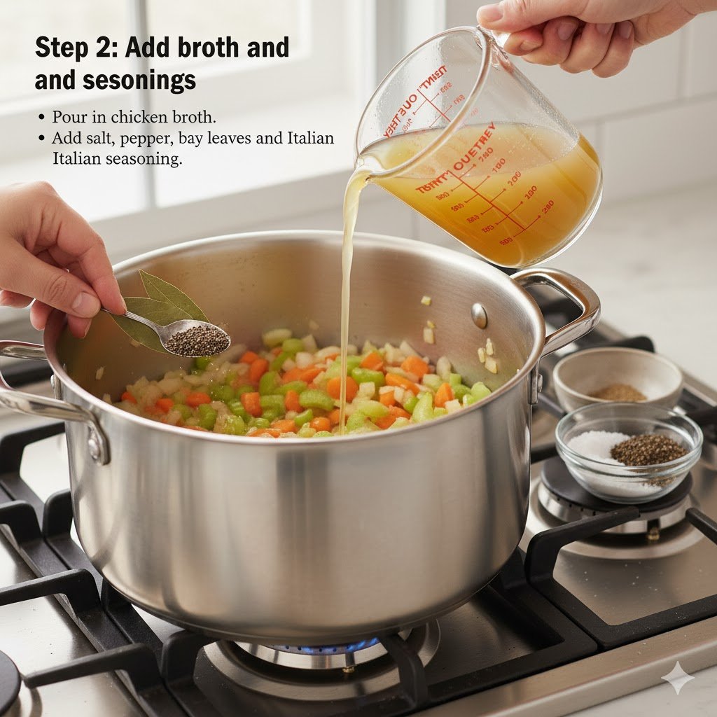 Pour in chicken broth and add salt, pepper, bay leaves, and Italian seasoning.