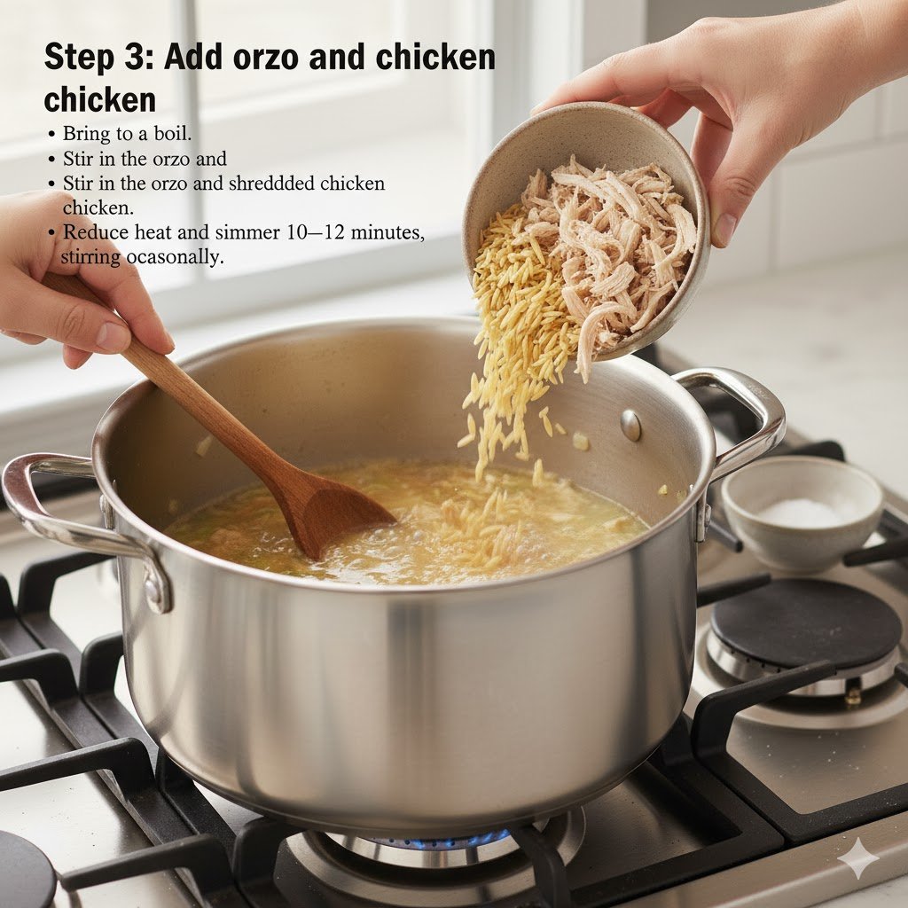 Bring to a boil. Stir in the orzo and shredded chicken. Reduce heat and simmer 10–12 minutes, stirring occasionally.