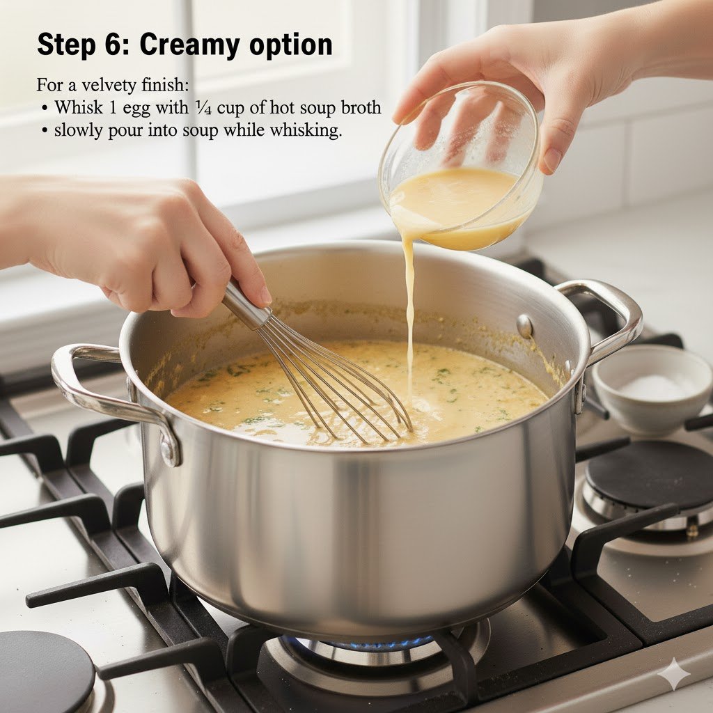 Whisk 1 egg with ¼ cup of hot soup broth → slowly pour into soup while whisking.
