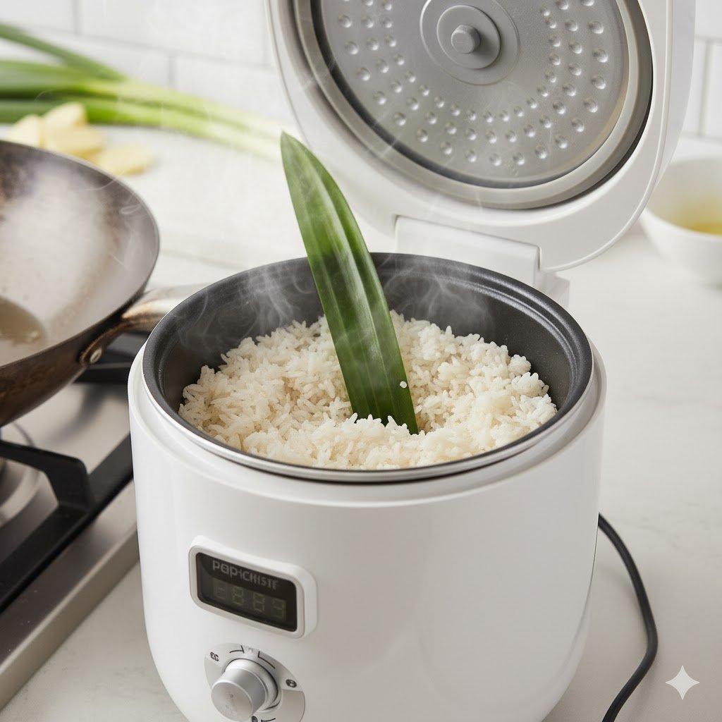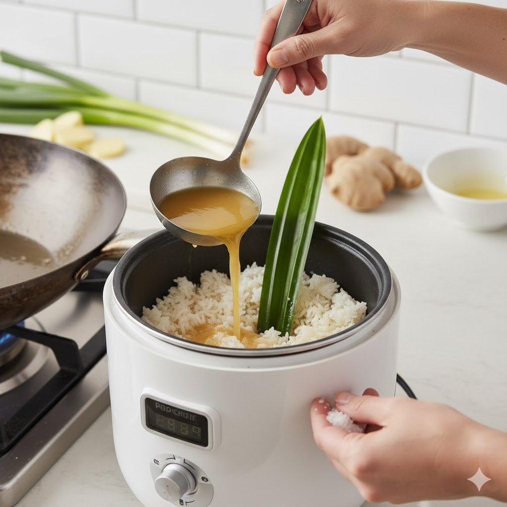 Transfer the rice into a rice cooker. Add chicken stock, pandan leaf, and a pinch of salt.