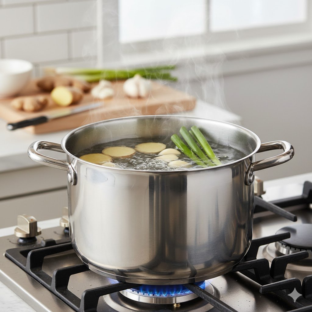 Bring a large pot of water to a boil with ginger, garlic, and spring onions.