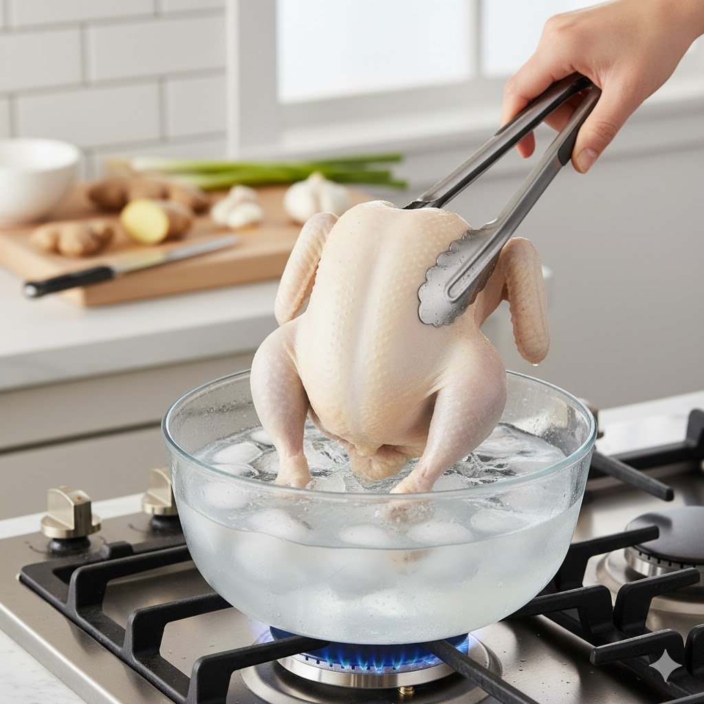 Remove chicken and immediately submerge it in ice-cold water for 5 minutes (to keep it tender and firm).