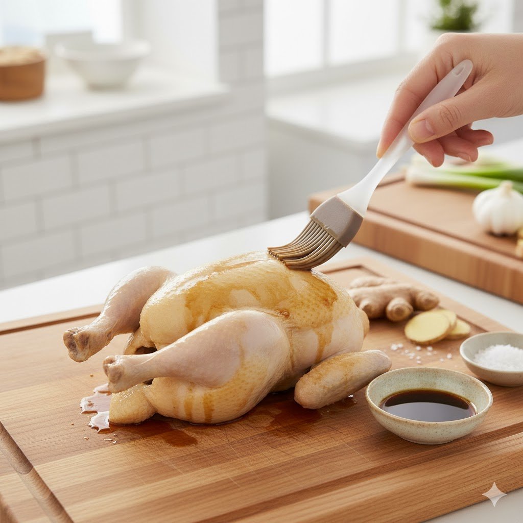 - Brush the chicken with sesame oil and soy sauce mixture. Set aside to rest before cutting into pieces.