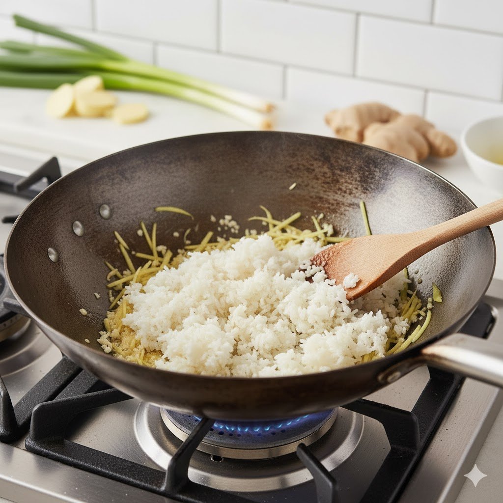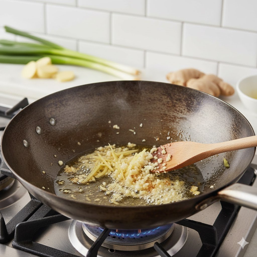 - Heat oil or chicken fat in a wok, sauté minced garlic and ginger until fragrant.