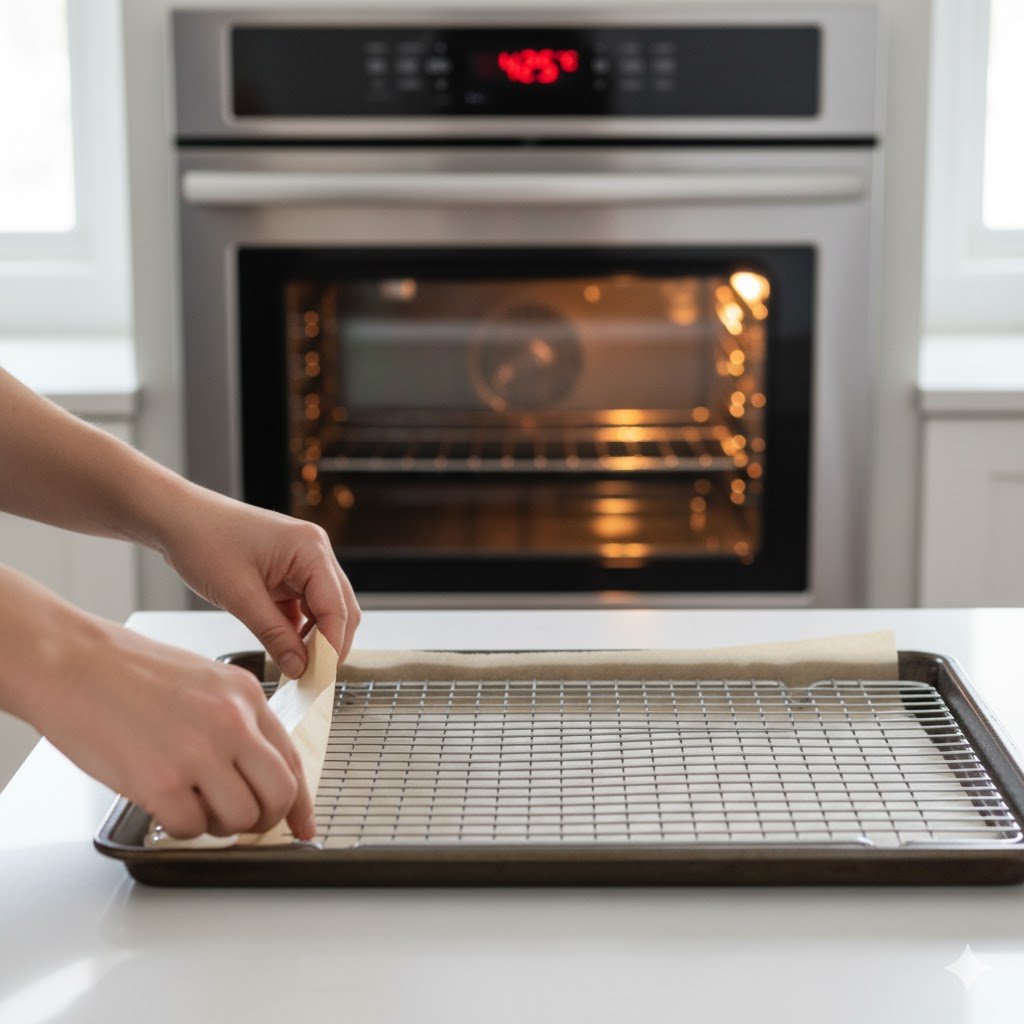 Set your oven to 425°F (220°C). Line a baking sheet with parchment paper or aluminum foil and place a wire rack on top.
