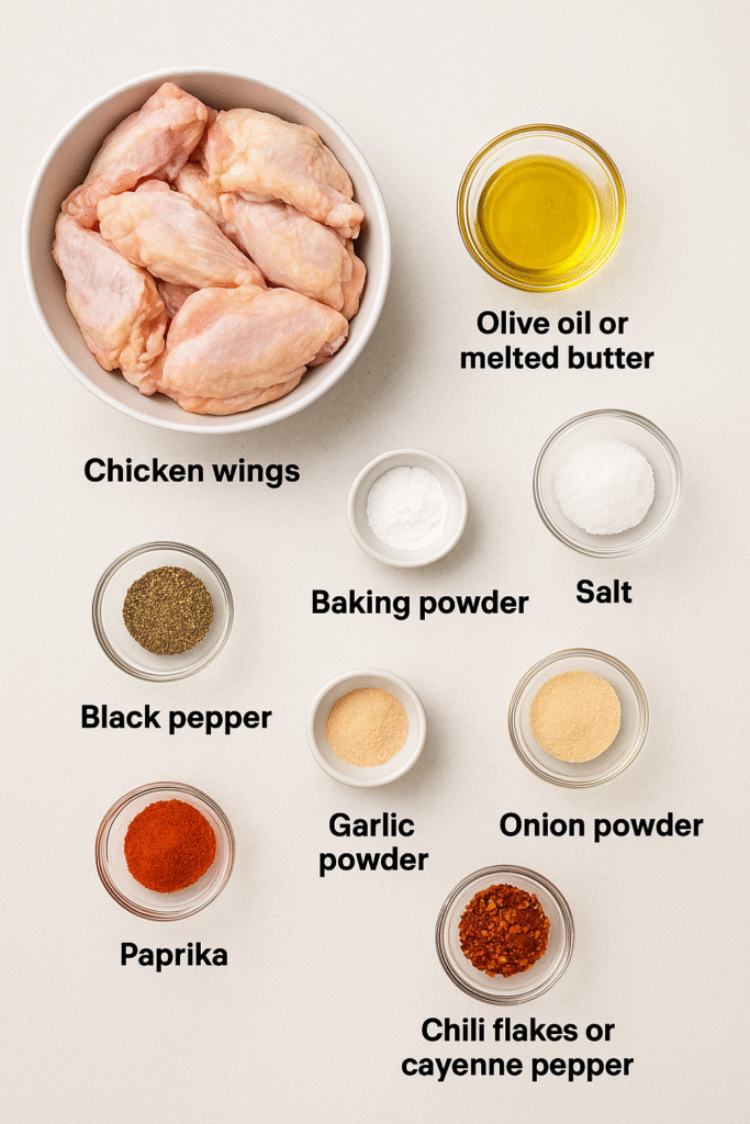 In a large bowl, mix the wings with olive oil. Combine baking powder, salt, pepper, garlic powder, paprika, onion powder, and chili flakes in a small bowl. Sprinkle the mixture over the wings and toss until evenly coated.
