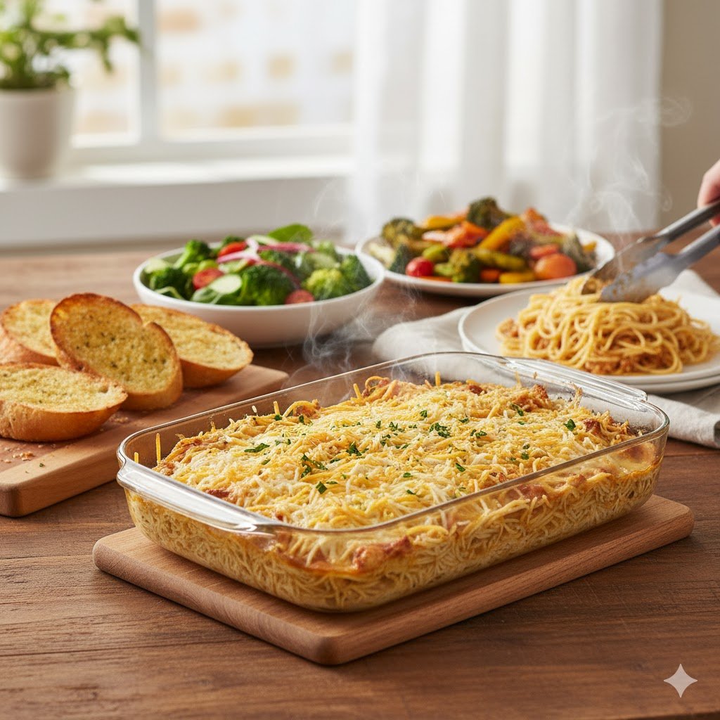 Chicken Spaghetti is the perfect combination of creamy, cheesy, and savory flavors all tangled in…