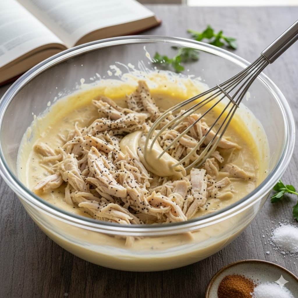 Stir in the shredded chicken and poppy seeds. Coat evenly.