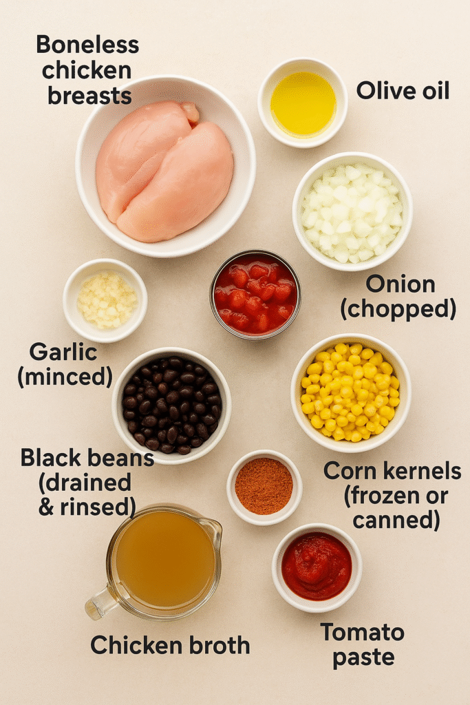 Pour in chicken broth, diced tomatoes, tomato paste, black beans, and corn. Stir everything together.