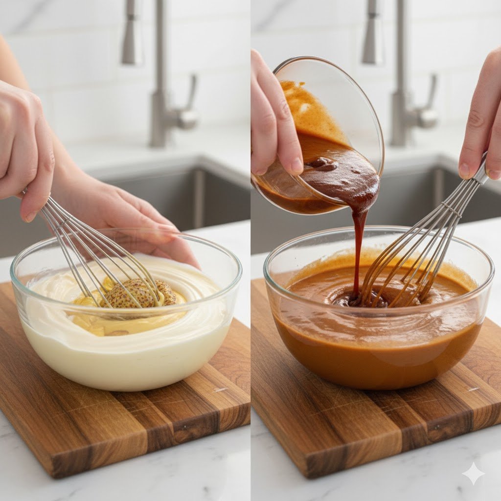 - In a bowl, mix mayonnaise, mustard, Dijon, and honey until creamy.