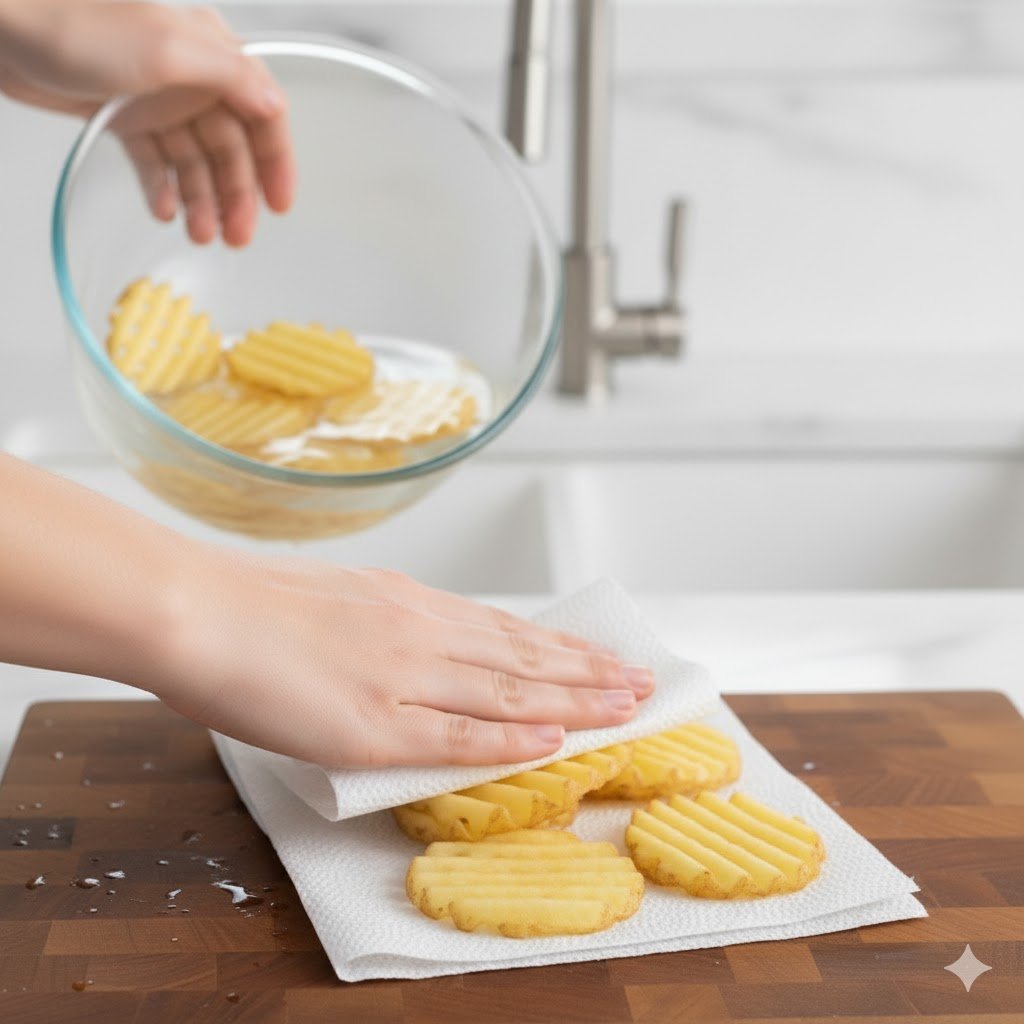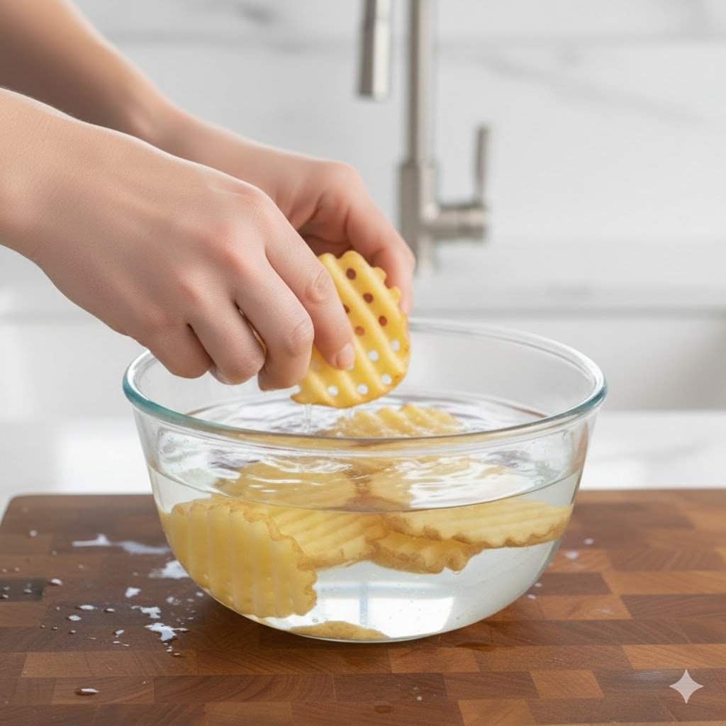 - Soak sliced potatoes in cold water for 20–30 minutes to remove starch.